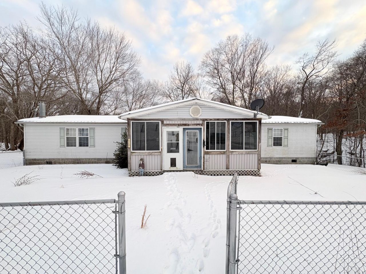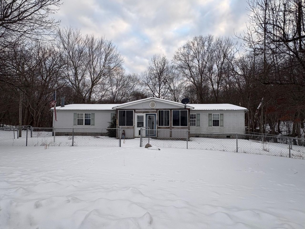 11824 Backus Mountain Rd. 3 BR, 2 bath manufactured home on ~0.4 acres in a rural setting, yet conveniently located on paved Backus Mt Rd. Rooms are spacious with cathedral ceilings. Cozy kitchen/ dining area with fireplace and island. Hardwood floors in main areas. Primary Bedroom with walk in closet, large bath featuring a walk-in shower and garden tub. Nice enclosed front porch with surround windows and propane heater. Block foundation. Paved driveway. Central heat/air. Partially fenced yard. Generator. Back of property has a unique cliff view and front view is farmland. Bank owned, sold ''as is.''